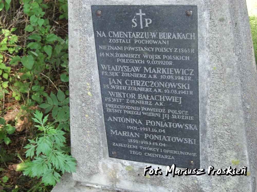 Cmentarz położony jest na skraju nieistniejącego już chutoru Buraki w pobliżu Falewicz. Po zabudowaniach nie pozostał już żaden ślad, O życiu Polaków na tej ziemi świadczy krzyż na rozstaju dróg i maleńki, położony wśród prawie stuletnich drzew cmentarzyk. Pochowani są na nim Powstańcy Styczniowi, żołnierze walczący o utrwalenie granic w 1920 roku (14 żołnierzy o nieustalonej tożsamości), żołnierze AK (4 żołnierzy) oraz rodzeństwo (Antonina i Marian Poniatowscy) przez lata  opiekujące się tym cmentarzem.  Na grobach stoją proste betonowe krzyże. Przy wejściu na cmentarz znajduje się pomnik z krzyżem, na którym widnieje napis: