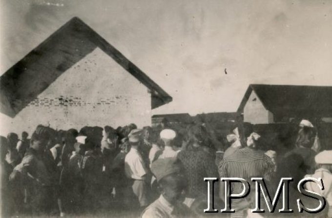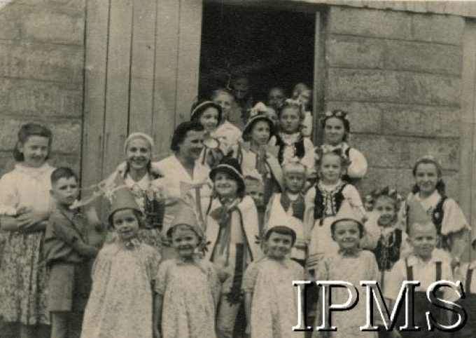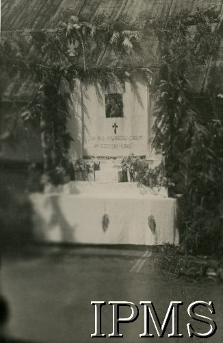 „Osiedle dla polskich uchodźców. Ołtarz przygotowany na uroczystość Bożego Ciała. Znajdował się koło domu księdza Górki, przystrajali go państwo Niedopytalsy i uczniowie klasy VII. Napis pod krzyżem: „Tak nas powrócisz cudem na ojczyzny łono”. (cytat z „Pana Tadeusza” Adama Mickiewicza).”