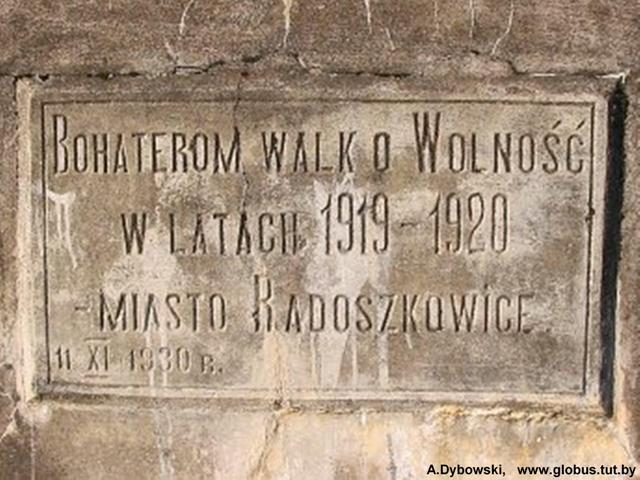 Na cmentarzu katolickim przy ul. Sowieckiej w Radoszkowicach znajduje się kwatera wojenna składająca się z 19 mogił żołnierzy Wojska Polskiego ułożonych w trzech rządach. W centralnej części kwatery mieści się pomnik w formie prostopadłościennego postumentu na płytowej podstawie. Na pomniku znajduje się napis w języku polskim: „Bohaterom walk o wolność w latach 1919-1920 miasto Radoszkowice. 11 XI 1930”.